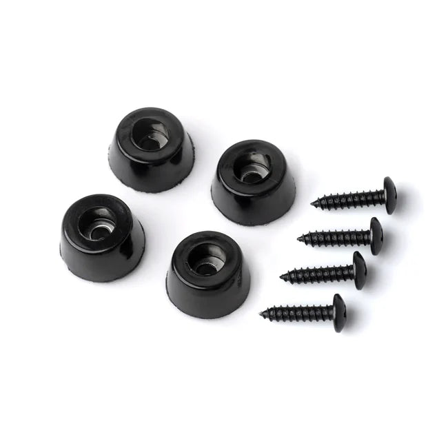 Extra sturdy rubber-like plastic bumper feet with black oxide stainless-steel screws and built-in reinforced metal washers. The washers are designed to help stabilize the bumper when fastened to wood and prevents the screw from stripping through the material. These bumpers also have a more industrial look and are designed to keep cutting boards from slipping while elevating the bottom of the board from wet surfaces.